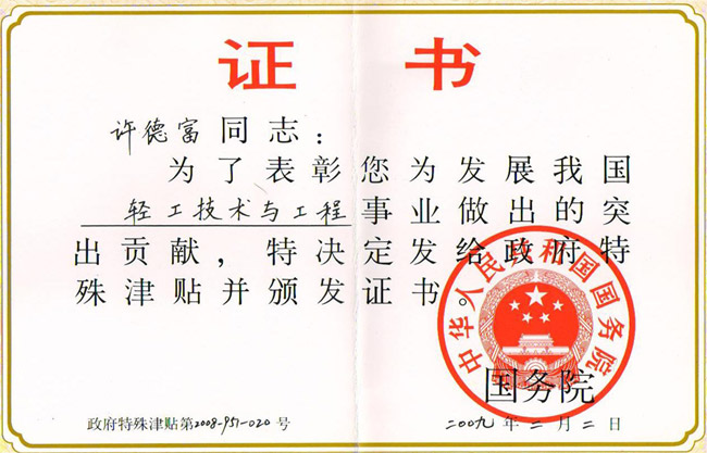 國務(wù)院特殊津貼證書